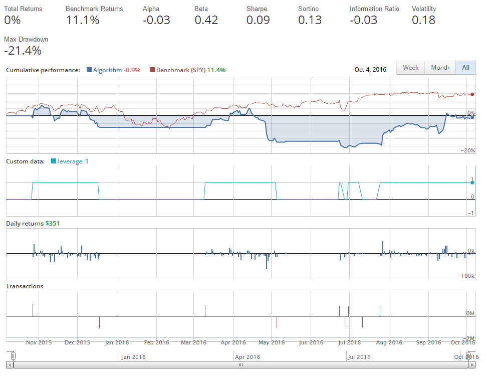 The shorting is causing this. When we short a company on Quantopian, we've got negative shares. For example, let's say we short 100 shares of Apple. This means we have a -100 share position in Apple. Then consider we want to change our position to be holding 100 shares of Apple. We actually need to buy 100 shares to just be at 0 shares, then another hundred shares to be at +100. The same is true to go from +100 to -100. This is why we have those seemingly double-sized trades, without leverage. So we're about -7% by buying (going long), and shorting Apple, depending on the moving average crossovers. What might happen if we just buy and sell instead of buying and shorting?